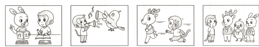 动物学校要举办本领大赛了!每位小动物都要学习一项本领来参加比赛。根据下面的图画思考:小猴学了什么本领?结果又是怎样的?写的时候,用上下面的词语。(不会写的字用拼音代替)