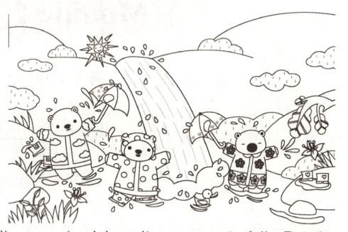 A bear bought her babies raincoats and rain boots. “I want to play in the rain,” said one little bear. “But it is sunny. I wish it would rain,” said another baby bear. “I hear it always rains in the rock mountains.” The baby bears went to the mountains all together wearing their raincoats and rain boots. “I can hear the rain,” said one baby bear. “I guess it is raining somewhere nearby,” said another baby bear. “Hooray! It is raining!” cheered the baby bears. But it was not raining. It was a waterfall. But the baby bears thought it was raining. “It is fun to play in the rain,” cheered the baby bears.