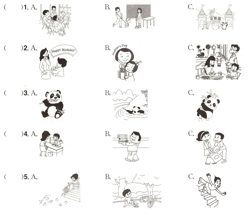二、听录音,选择相应的图片,将其序号填入题前括号里。(5分)