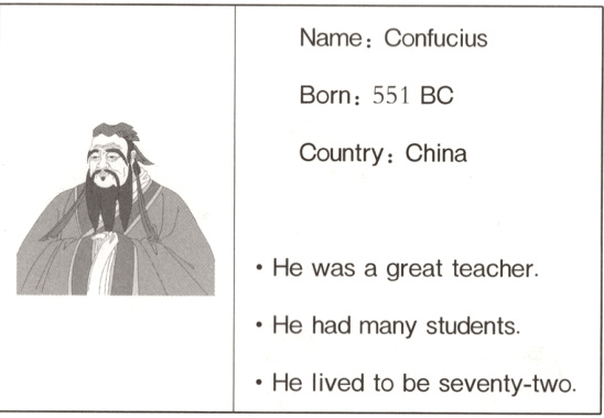 Look at this picture. This man is Confucius. He was born in 551 BC in China. He was a great teacher. He had many students. He lived to be seventy - two. And he is very famous all over the world.