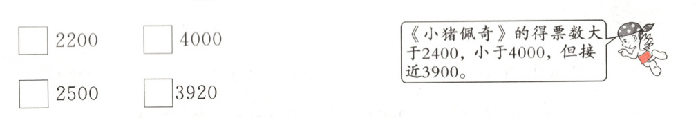 三、光明小学进行“我最喜欢的动画片”评选活动,你知道《小猪佩奇》的得票数是多少吗?在□里画“√”。
