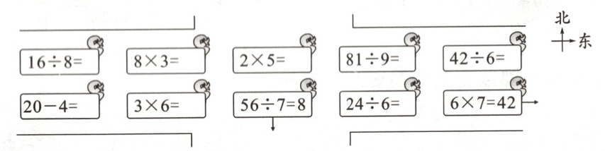 二、照样子算一算,标一标。(得数小于9的朝南走,其余的朝东走)