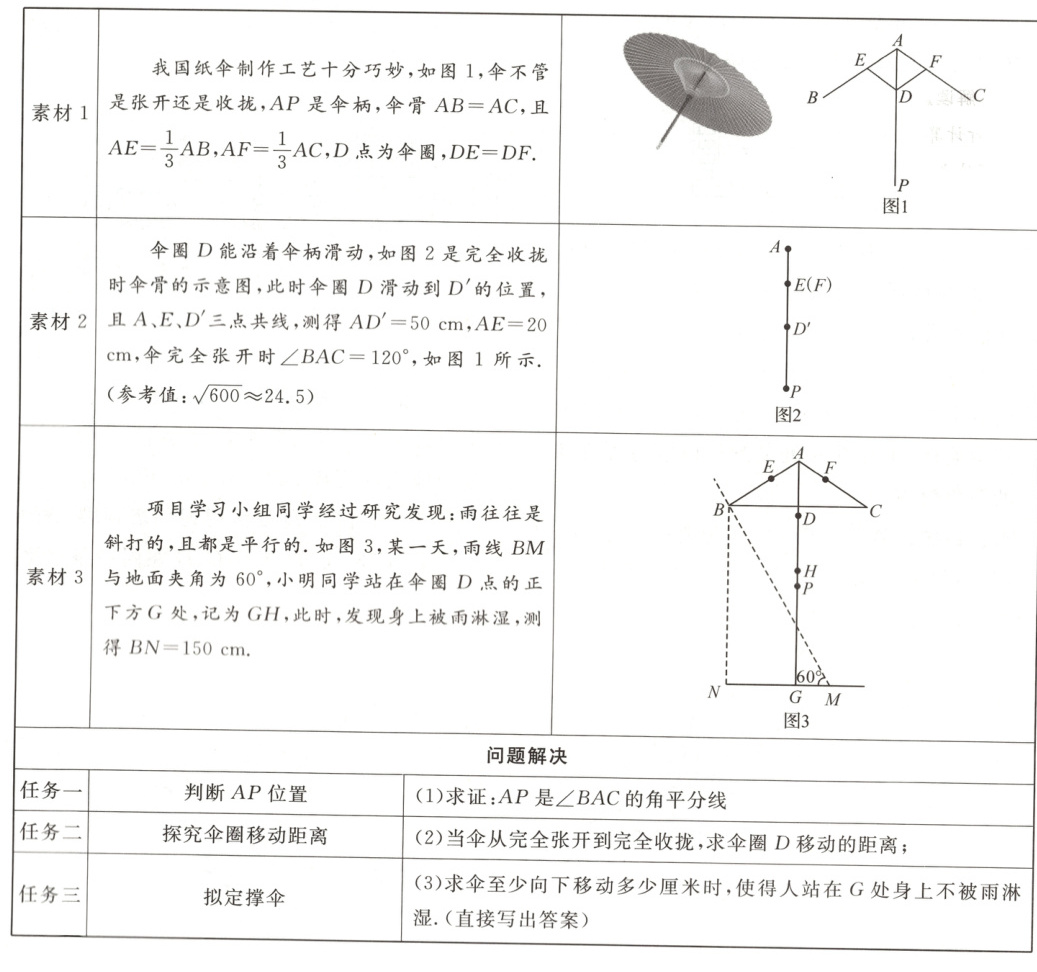 ∴DD' = AD' - AD = 50 - 34.5 = 15.5(cm).答:当伞从完全张开到完全收拢,伞圈D移动的距离为15.5 cm;