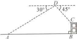3. (2024·内蒙古)综合实践活动中,数学兴趣小组利用无人机测量大楼的高度. 如图,无人机在离地面40 m的$D$处,测得操控者$A$的俯角为$30^{\circ}$,测得楼$BC$楼顶$C$处的俯角为$45^{\circ}$,又经过人工测量得到操控者$A$和大楼$BC$之间的水平距离是80 m,则楼$BC$的高度约是______m. (点$A$,$B$,$C$,$D$都在同一平面内,参考数据:$\sqrt{3}\approx1.7$)