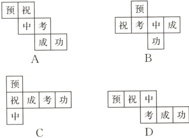 3. 小亮为今年参加中考的好友小杰制作一个正方体礼盒(如图),六个面上各有一个字,连起来就是“预祝中考成功”,其中“预”字对面是“中”,“成”字对面是“功”,则它的平面展开图可能是 ( )