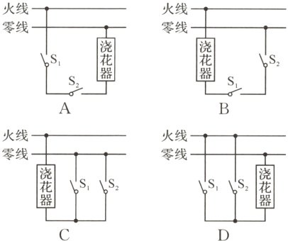 13.(科学思维)小明设计了一种晚上自动给花草浇水的电路。光控开关S₁在天黑时闭合,湿敏开关S₂在土壤过于干燥时闭合。浇花器仅在土壤过于干燥的夜间才开始工作,对花草进行浇水。下列电路既满足上述条件,又符合安全用电原则的是( )