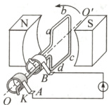 5. (教材变式题)如图是实验室用的手摇发电机,把发电机跟小灯泡串联起来,缓慢转动线圈,看到小灯泡会发光,这说明电路中有了__________。线圈转动越快,灯泡越亮,这说明电流__________跟线圈的转速有关。把两个发光二极管极性相反地并联起来,与发电机串联,转动摇把,两个二极管交替发光,说明电路中产生的是__________。