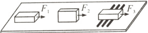 10. 在研究摩擦力时,小明同学用一块各侧面光滑程度完全相同的木块,在同一水平桌面上进行了三次实验。如图所示,当用弹簧测力计水平拉木块做匀速直线运动时,弹簧测力计三次示数F₁、F₂、F₃的大小关系为( )