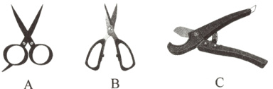 4. (教材变式题)如图所示,是三种类型的剪刀的示意图,请你为铁匠师傅选择一把剪铁皮的剪刀,你会选择______(选填“A”“B”或“C”)剪刀,这样选择的目的是省______。理发师应该选______剪刀。
