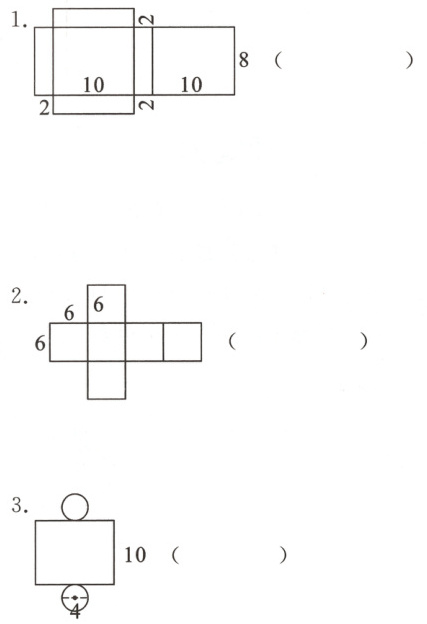 二、观察下面三幅立体图形的展开图,先在括号里填出立方体图形的名称,再计算出这个立体图形的表面积和体积。(单位:cm)