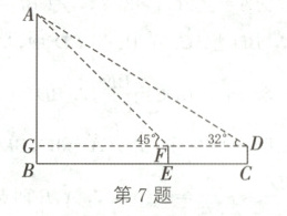 7. (25分)(荆州中考)荆州城徽“金凤腾飞”立于古城东门外. 如图,某校学生测量其高AB(含底座),先在点C处用测角仪测得其顶端A的仰角为32°,再从点C向城徽走6.6 m到点E处,测得顶端A的仰角为45°. 已知B,E,C三点在同一条直线上,测角仪离地面的高度CD = EF = 1.5 m,求城徽的高AB(参考数据:sin 32°≈0.530,cos 32°≈0.848,tan 32°≈0.625).