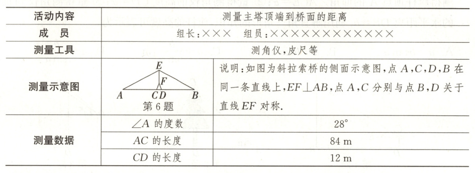 请利用表中提供的信息,求主塔顶端E到桥面AB的距离(参考数据:sin 28°≈0.47,cos 28°≈0.88,tan 28°≈0.53).