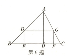 9. 如图,在△ABC中,BC = 12,边BC上的高AH = 8,矩形DEFG的边EF在边BC上,顶点D,G分别在边AB,AC上。设DE = x,矩形DEFG的面积为y,则y与x之间的函数关系式为___________。