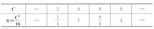 (1) 由题意,得S = ($\frac{C}{4}$)² = $\frac{C²}{16}$(C>0). 列表如下: