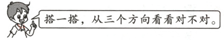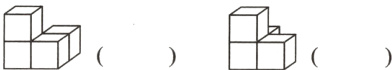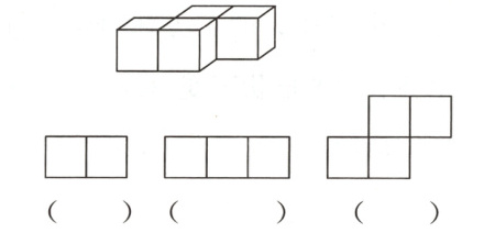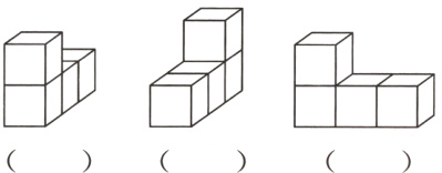 一 按从不同方向看到的图形,搭一个用4个小正方体组成的立体图形。哪个搭得对?在对的括号内画“√”。