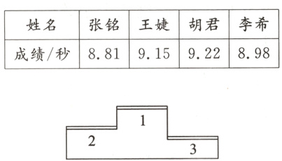 七 四年级四位同学50米赛跑成绩如下表。请你在领奖台的相应位置写出前三名同学的姓名。