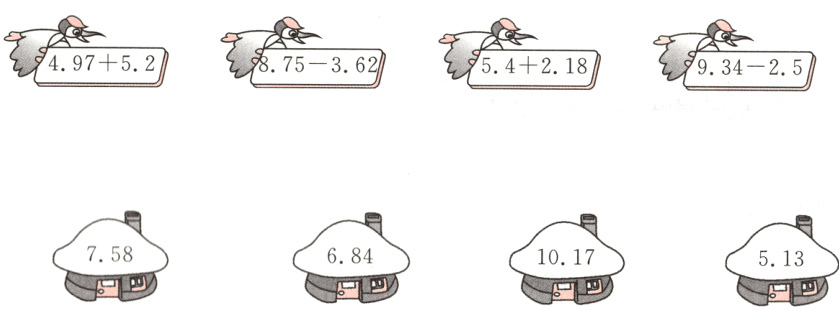 三、4.97+5.2——10.17 8.75 - 3.62——5.13 5.4+2.18——7.58 9.34 - 2.5——6.84