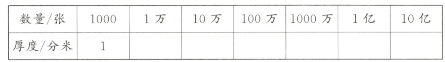 10.珂珂研究10亿张普通$A4$纸叠起来大约有多高,她先数出1000张纸叠起来,量了一下厚度大约是1分米,然后列表进行推算,请你帮助珂珂把表格填写完整。