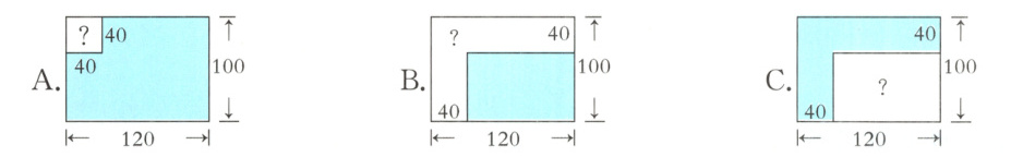 2. [新角度]一块长方形铁皮,长$120cm$,宽$100cm$,现在将长和宽分别截去$40cm$,求面积减少了多少平方厘米,下面画图表示正确的是( )。(单位$:cm)$