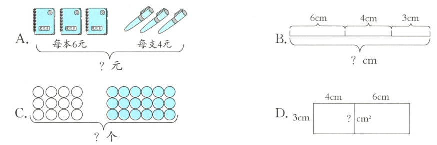 4. 下面各图中,不能说明“6×3 $+$ 4×3与(6 $+$ $4)×3”$相等的是( )。