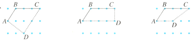 六、现要求在下面的点子图中再选一个点$D$,使四边形$ABCD$成为一个梯形,请你画一画。(画出三种不同的情况)(6分)