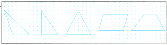 3. 在下面的点子图上分别画一个钝角三角形、一个直角三角形、一个等腰三角形、一个平行四边形和一个梯形。(10分)