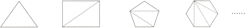 4. [新角度]三角形的内角和是180°,将下面的四边形这样分割,就可以算出四边形内角和:180°×2 $=$ 360°。你能用这样的方法计算下面的五边形、六边形的内角和吗$?(6$分)
