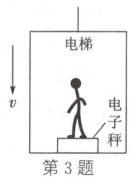 3. 如图所示,某同学站在电梯内的电子秤上,在电梯向下匀速运动的过程中,电子秤的示数________(填“大于”“小于”或“等于”)该同学所受重力大小。在电梯减速停靠一楼的过程中,电子秤的示数比该同学所受重力________(填“大”或“小”)。