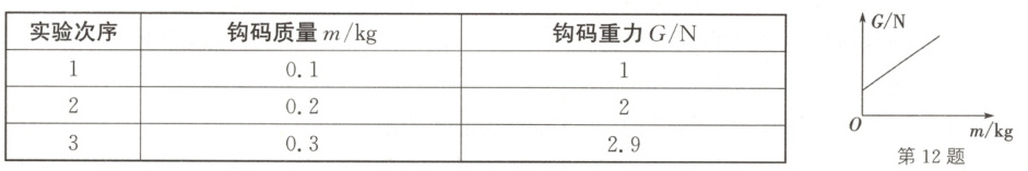 12. (2024·商丘梁园期中)小强同学做“探究物体所受重力的大小与质量的关系”实验:分别测出2个钩码、4个钩码、6个钩码(1个钩码的质量为50g)的重力大小,记录如表: