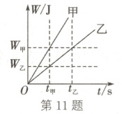 11. 如图所示为甲、乙两个物体做功与所需时间的关系图像,由图可知,甲物体做功的功率$P_{甲}$与乙物体做功的功率$P_{乙}$相比 ( )