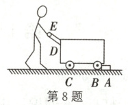8. ★超市里的手推车如图所示,某顾客推着空车前进时,当前轮遇到障碍物A时,顾客向下按扶把,这时手推车可看成杠杆,支点是_______点;当后轮遇到障碍物A时,顾客向上提扶把,这时支点是_______点。