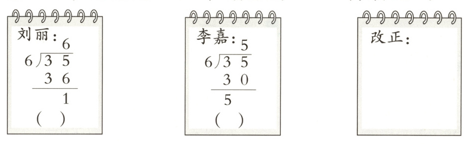3. 下面是刘丽和李嘉计算“35÷6=”的过程,请你判断一下,对的画“√”,错的画“×”并改正 。