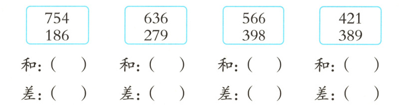 ⑤279+396 ⑥647−369 ⑦248+389 ⑧988−289