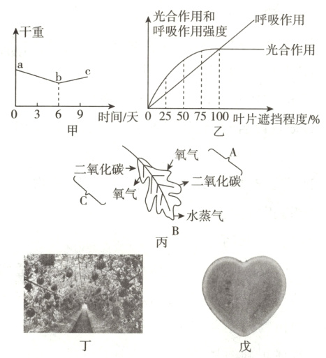 11. [2024·淄博期末]某现代化温室大棚内培育的西瓜皮薄、瓤甜、形状各异,深受消费者喜爱。为了得到产量高、品质好的西瓜,技术人员研究了西瓜生命活动规律。图甲为西瓜种子在萌发成幼苗的过程中细胞干重(除去水的重量)变化的折线图,图乙表示叶片遮挡程度与光合作用和呼吸作用强度的关系,图丙表示西瓜白天进行的生理活动,图丁为西瓜立体种植模式图,图戊是某种西瓜果实实物图。请据图回答: