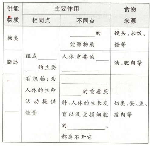 (2)糖类、脂肪、蛋白质的作用和食物来源