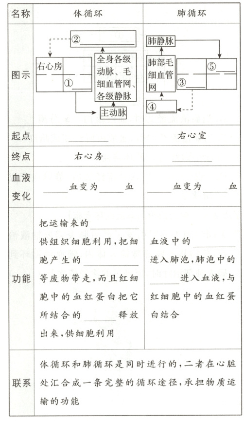 (1)①左心室 ②上腔、下腔静脉 ③右心室 ④肺动脉 ⑤左心房 左心室;左心房;动脉;静脉;静脉;动脉;营养物质;二氧化碳;氧;二氧化碳;氧