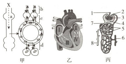 17. 真实情境 [2024·滨州中考]学校举行运动会,小明报名参加长跑项目。妈妈为他准备了早餐,有面包、牛奶、咸鸭蛋、油条。如图是人体部分结构与功能示意图,图中a~d表示生理过程,Ⅰ~Ⅳ表示心脏各腔,1~8表示结构。据图回答问题: