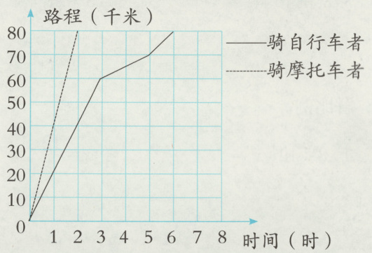 7. 下图表示两人骑自行车和摩托车在两城镇之间旅行的时间与路程的变化情况。