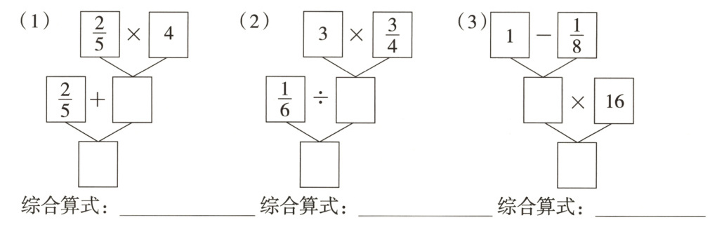 (1)$\frac{8}{5}$ 2 $\frac{2}{5}+\frac{2}{5}\times4 = 2$(2)$\frac{9}{4}$ $\frac{2}{27}$ $\frac{1}{6}\div(3\times\frac{3}{4})=\frac{2}{27}$(3)$\frac{7}{8}$ 14 $(1 - \frac{1}{8})\times16 = 14$