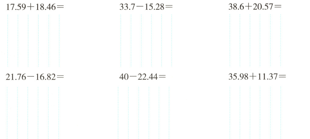 4.3 + 1.4 = 6.8 - 1.5 = 3.2 + 5.43 = 11.2 - 3.8 =