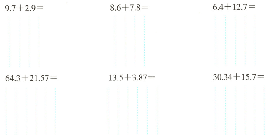 0.5 + 1.2 = 4.2 + 0.4 = 5.1 + 0.3 = 0.8 + 2.1 =