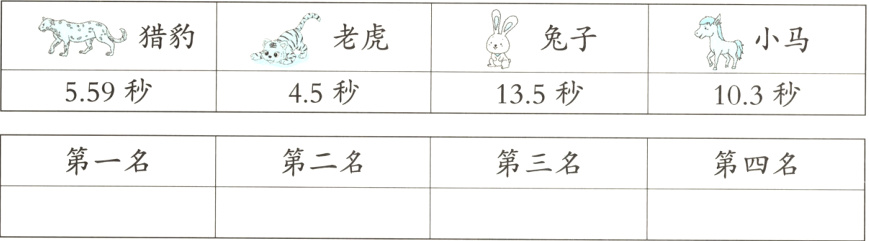 4. 下表是4只动物100米跑的成绩,把它们的名字填到对应的名次中。