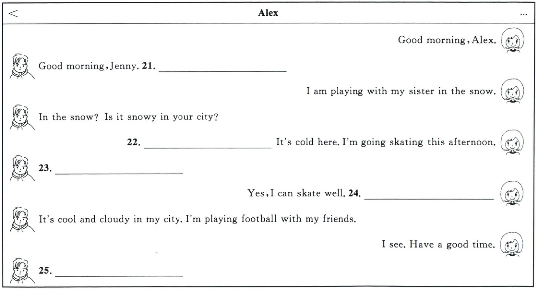 21. What are you doing (now)? 22. Yes, it is. 23. Can you skate (well)? 24. How's the weather in your city? /What's the weather like in your city? 25. Thank you.