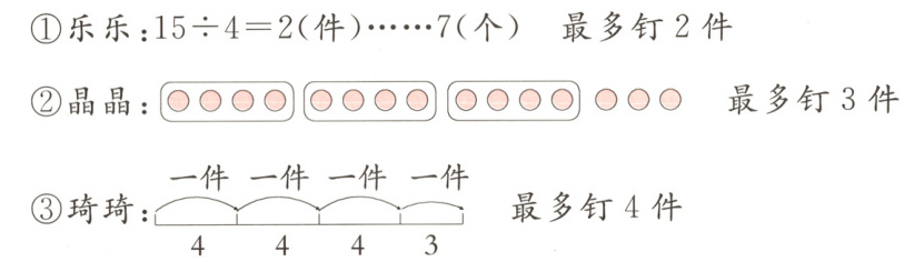 4. 共有15个扣子,每件衣服要钉4个扣子,最多可以钉几件衣服?( )同学的做法正确。