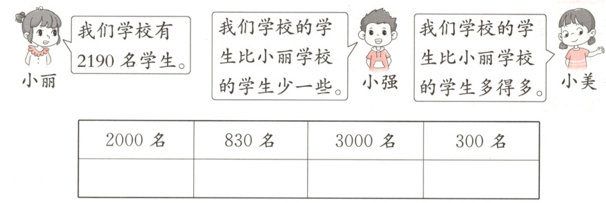 3. 小强的学校大约有多少名学生?画"√"。小美的学校呢?画"〇"。(4分)