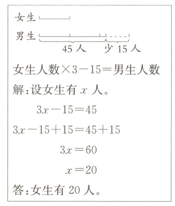 5. 新思维 数形结合 某旅游团到龙门石窟游玩,团队中男生有45人,比女生的3倍少15人,女生有多少人?请你结合评价项目及标准对左边明明的解答过程进行评价打分并填入表中。(注:每项都要打分)(4分)