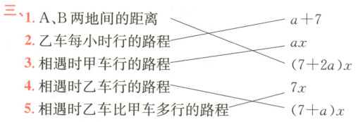 辨思维 对应思维 甲、乙两车从A、B两地同时相对开出,甲车每小时行a千米,乙车每小时比甲车多行7千米,x小时后两车相遇。(根据题意连线)