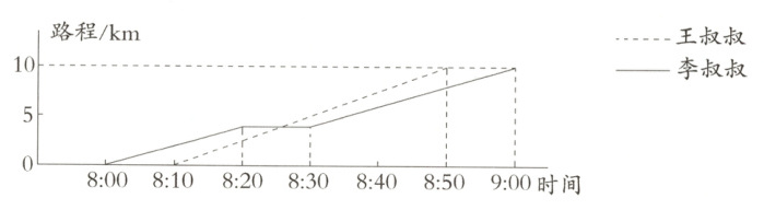 4. 李叔叔家和王叔叔家到王城公园的路程都是10千米,星期天李叔叔和王叔叔相约沿同一路线骑车去王城公园,李叔叔比王叔叔先出发,他俩所行的路程和时间的记录如图。下列说法正确的是( )。
