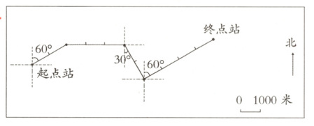 5路公交车从起点站先向北偏东60°方向行驶2千米,后向东行驶3千米,再向南偏东30°方向行驶2千米,最后向北偏东60°方向行驶4千米到达终点站。