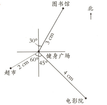 (3)电影院在健身广场的南偏东45°方向4000米处。(2分)